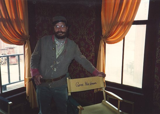 When shooting the scene where he bawls out the town ("This is MY town!"...), the extras playing townspeople were directed to act like we WERE being bawled out, we can't raise our eyes to his level, etc. It was impossible not to FEEL that way as he delivered his speech. Gene Hackman was also a very "regular" guy. He was friendly and approachable. One would not suspect, without knowing, that he's such a well-known and phenomenal actor. |