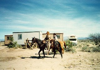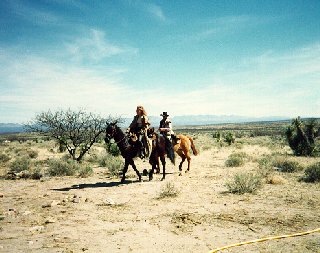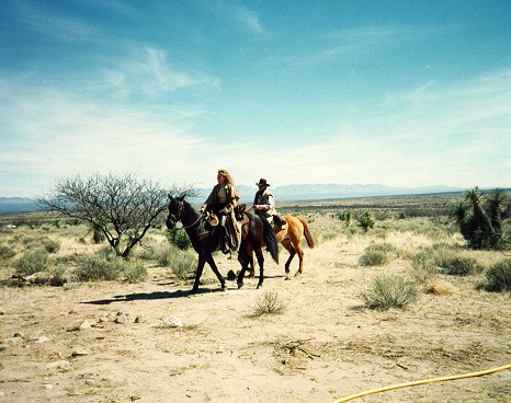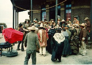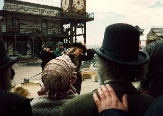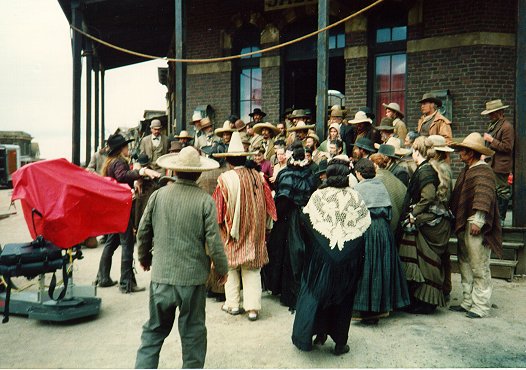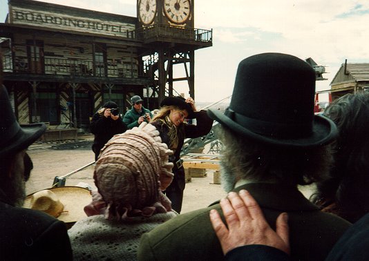 A case in point: Since she was in Tucson over Christmas, Sharon Stone helped serve Christmas dinner to the Tucson homeless. See the article in the Arizona Daily Star. One day we were shooting rain scenes with extras. It was a cool day, so between takes the extras were wet and cold. There were heaters set up in the saloon. During the first break from shooting, the extras rushed into the saloon and gathered around the heaters. Some Production Assistant attempted to chase the extras away from the heaters, saying they were only for the principles. Sharon Stone interceded, insisting that, since these people were wet and cold, they be permitted to warm up near the heat. Sharon's brother Michael played the head Councillor. |